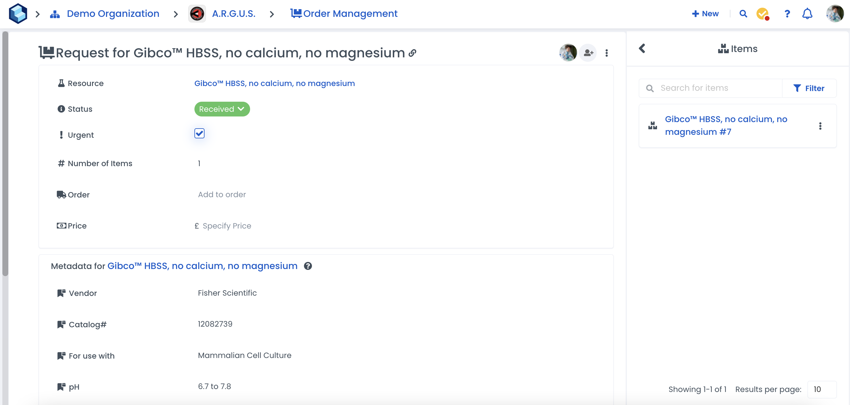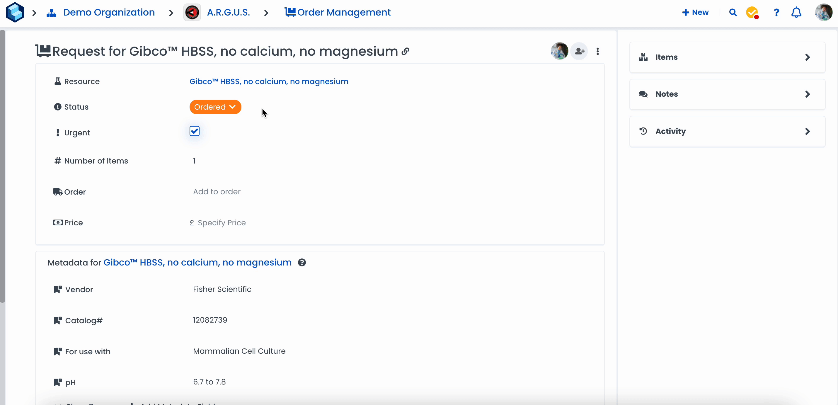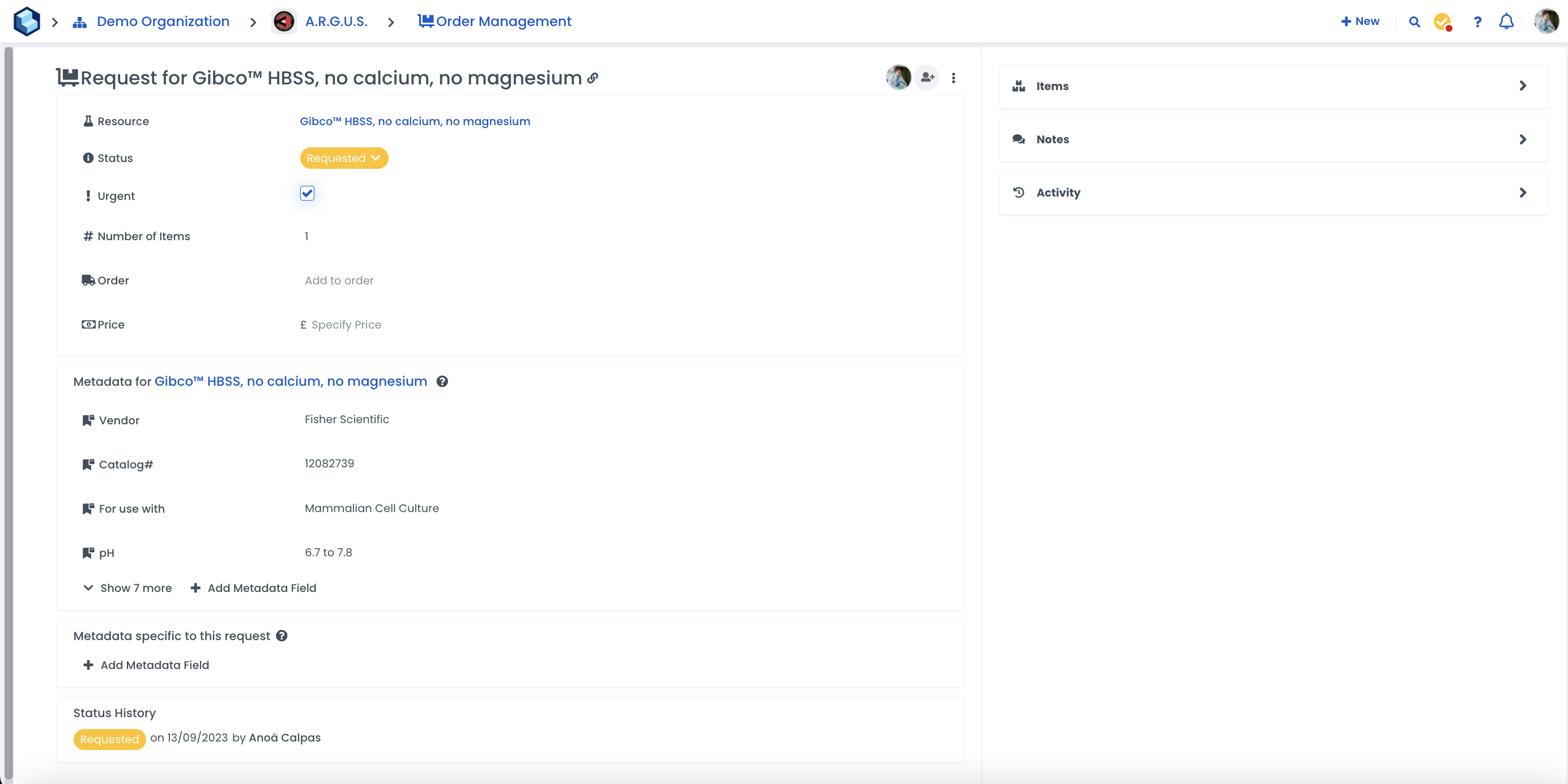 By clicking on an order, you'll be able to see its status, requested resource, quantity of items and urgency. Selecting the resource name will take you to the resource page which has all the specific resource details and history.