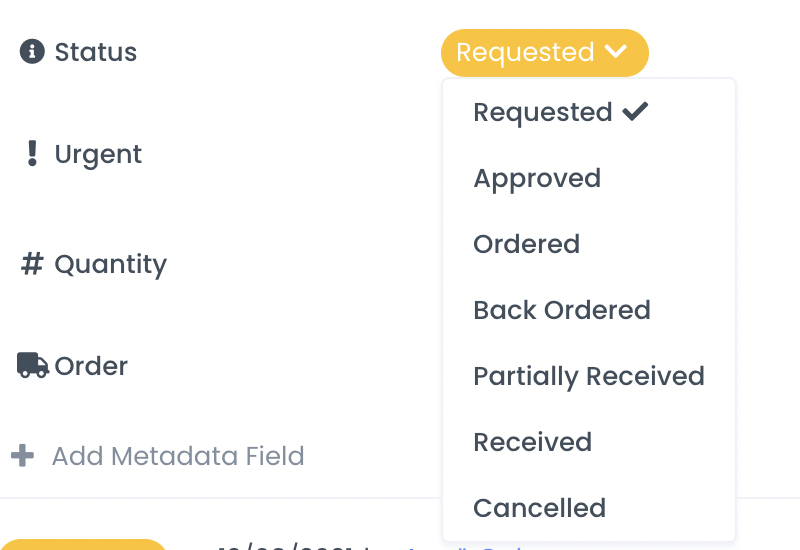 In addition to Order request notes, the status is a great way to keep everyone who has an interest in the purchase up to date. The full status history, including who adjusted the status is tracked in "Activity".