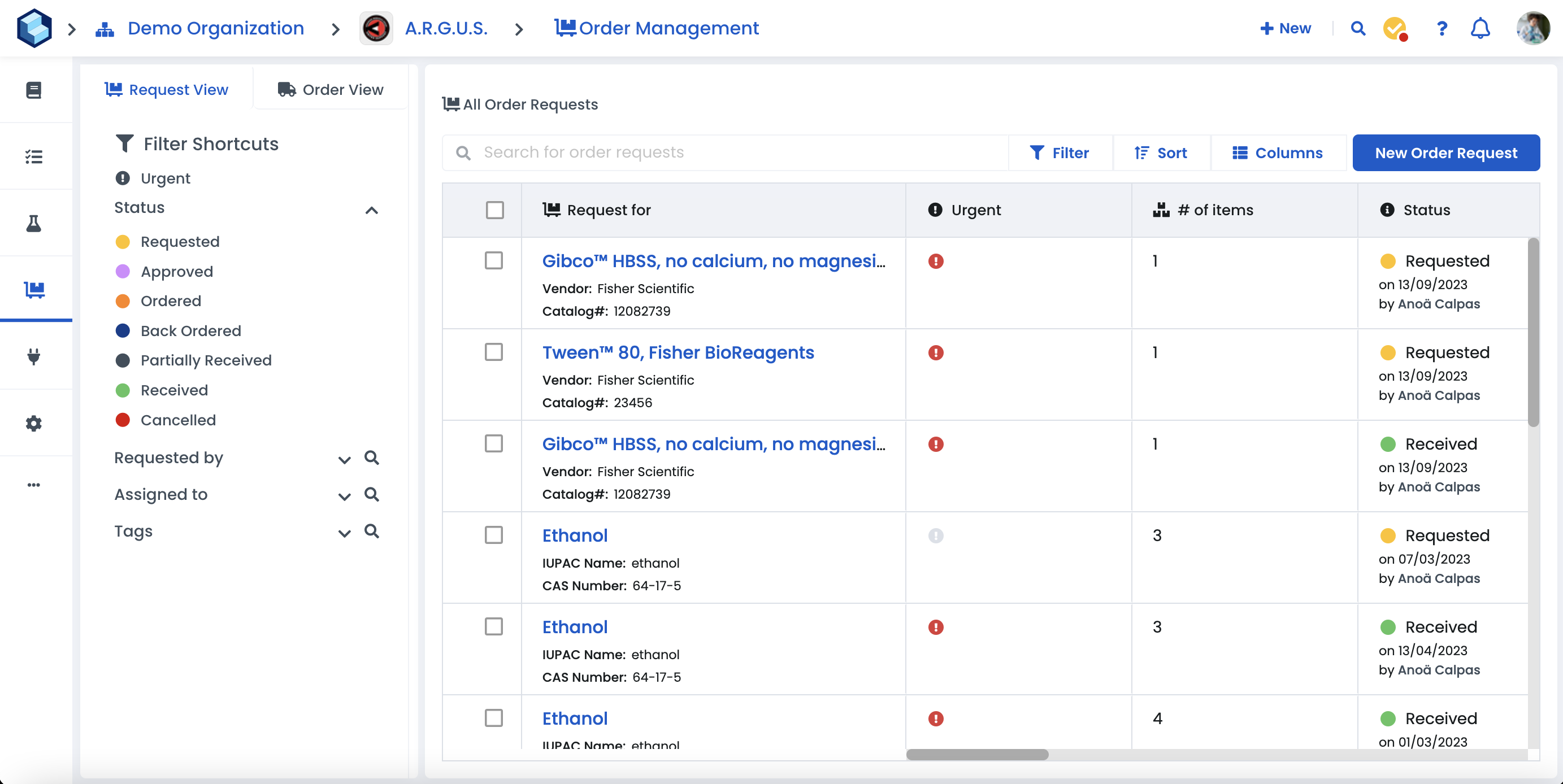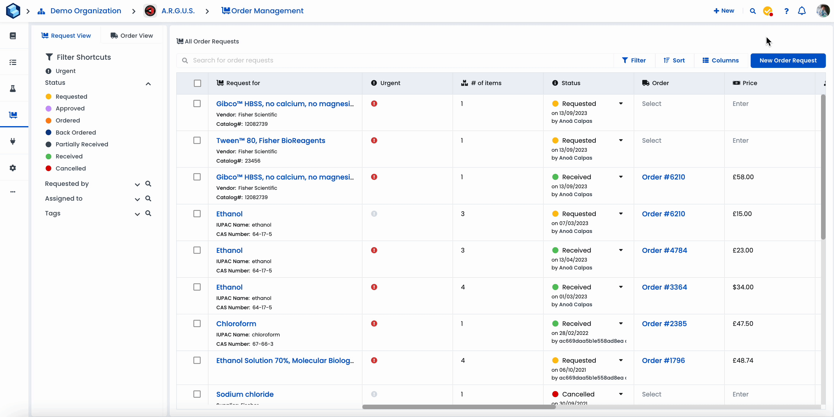 When you need something for your research, more often than not, someone else has to make the purchase for you. Order requests are an easy way to detail all the information about an item so that the person in your team responsible for purchasing can get you the right thing. The Order request is also used for the purchaser to keep the item requester in the loop. You can add the purchase information, such as PO, shipping information and price paid.