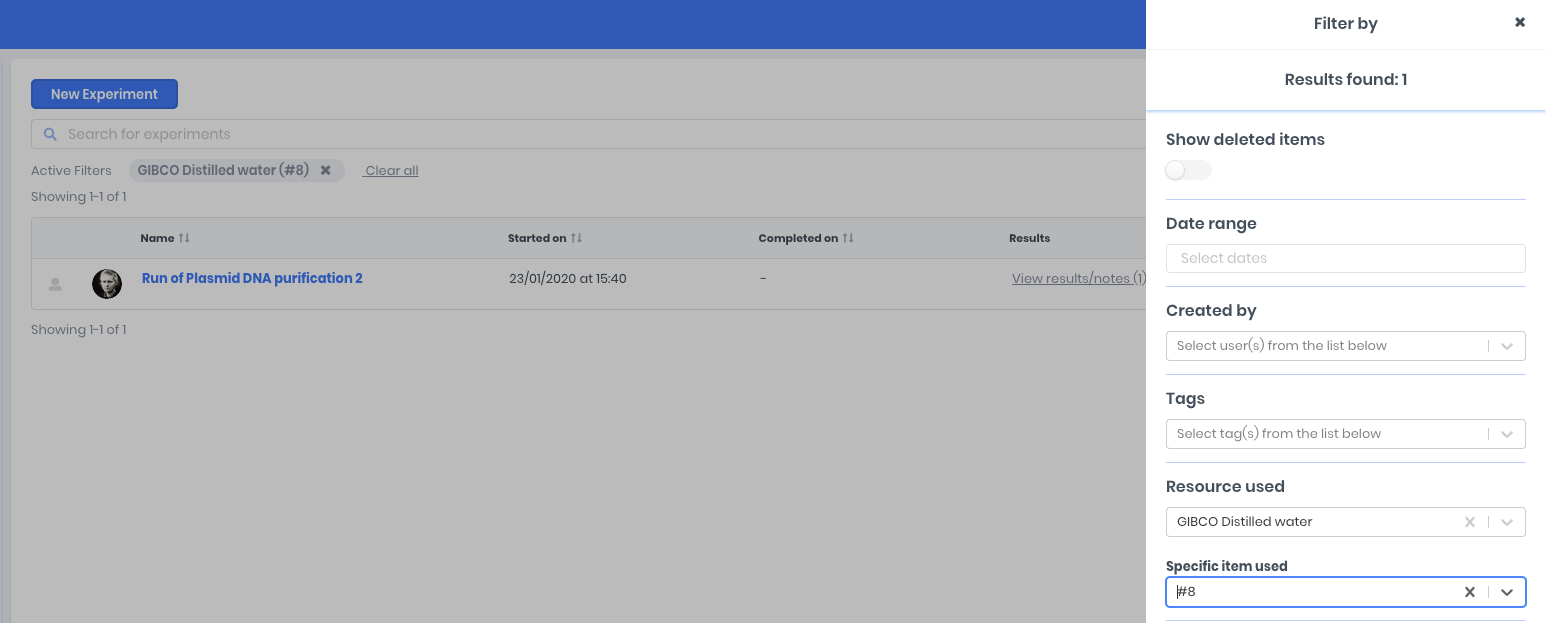 See all your experiments where particular resources or resource items were used. Great for tracking resource usage and watching out for possible contaminations. To do this, select "Filter" from the experiments view. You can then select a resource from your inventory and any associated resource item.