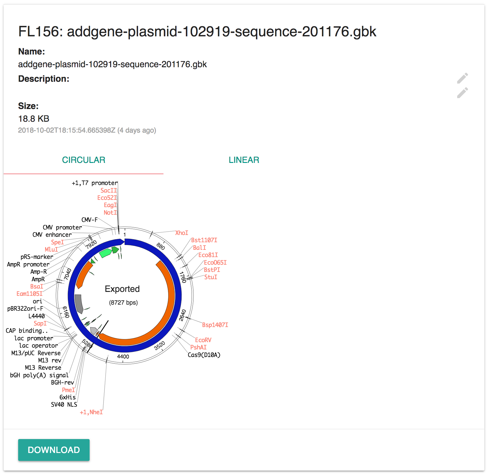 To view the map, upload a file (.gb, .gbk, .ape) and the plasmid will show automatically.