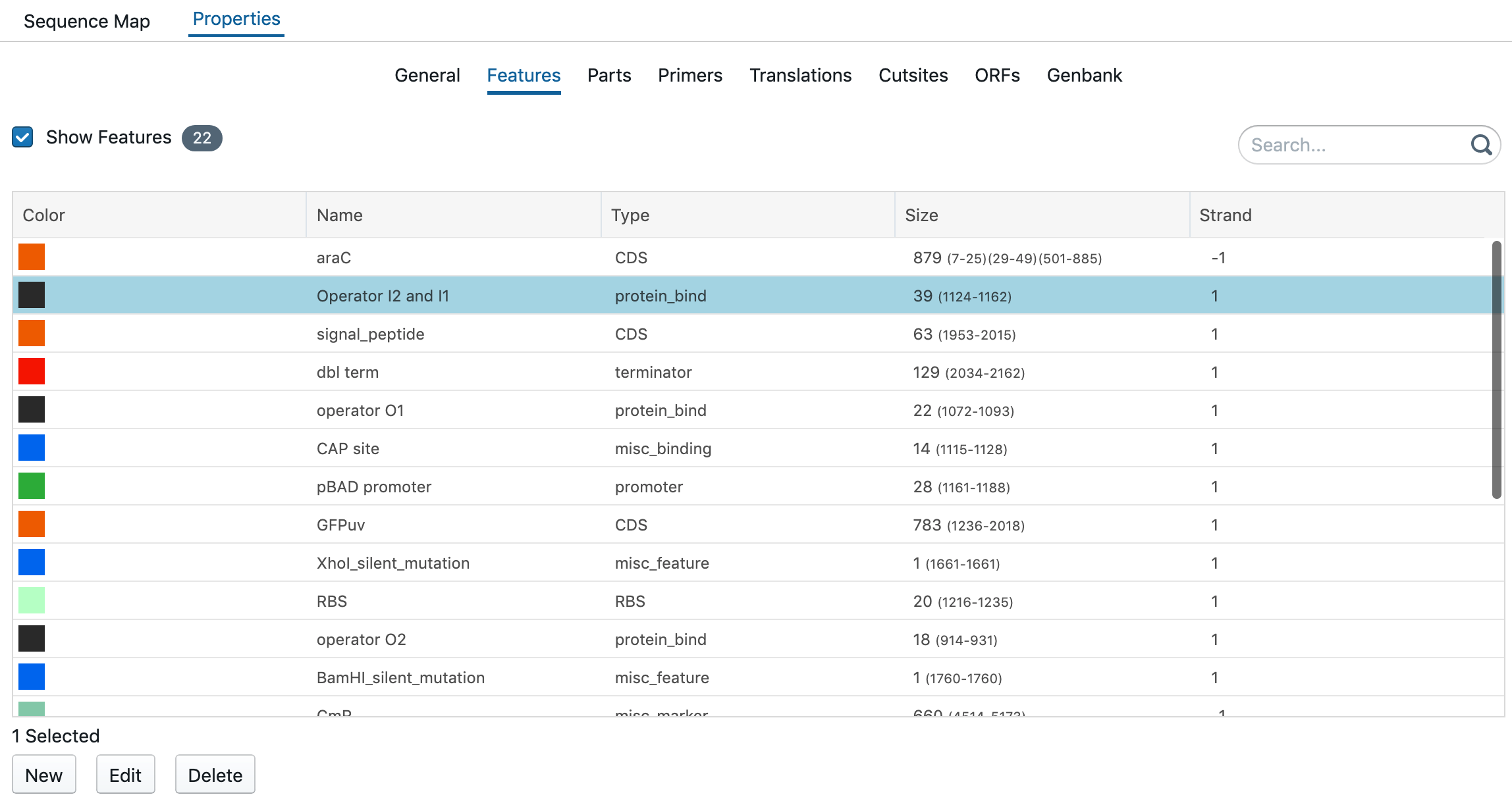 All features are summarized in the tab of Features. You have the option to change the color, name, type, strand. Select a sequence and right click to change, delete or create a feature. To reach this: