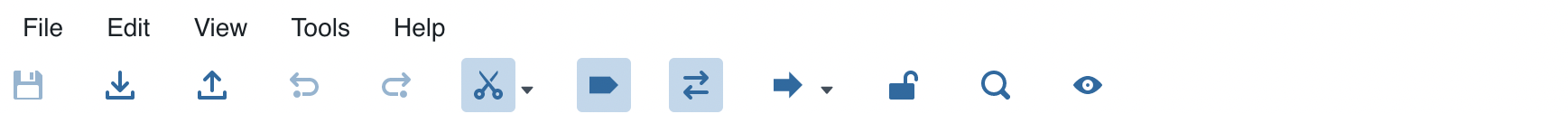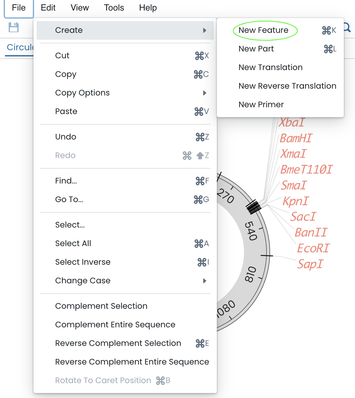 Edit → create, cut, copy, paste, undo, redo, find, go to, select, change case, complement selection, complement entire sequence, reverse selection, reverse entire sequence, rotate to caret position