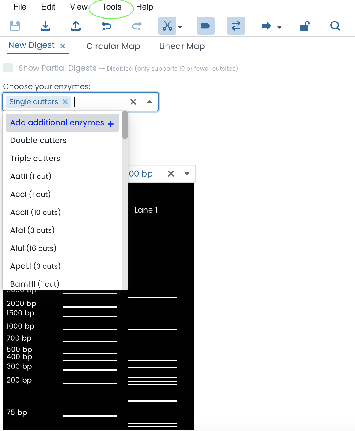 The 'Tools' tab allows users to virtually simulate an enzyme digestion using enzymes that match the DNA cut sites identified within the genetic sequence.