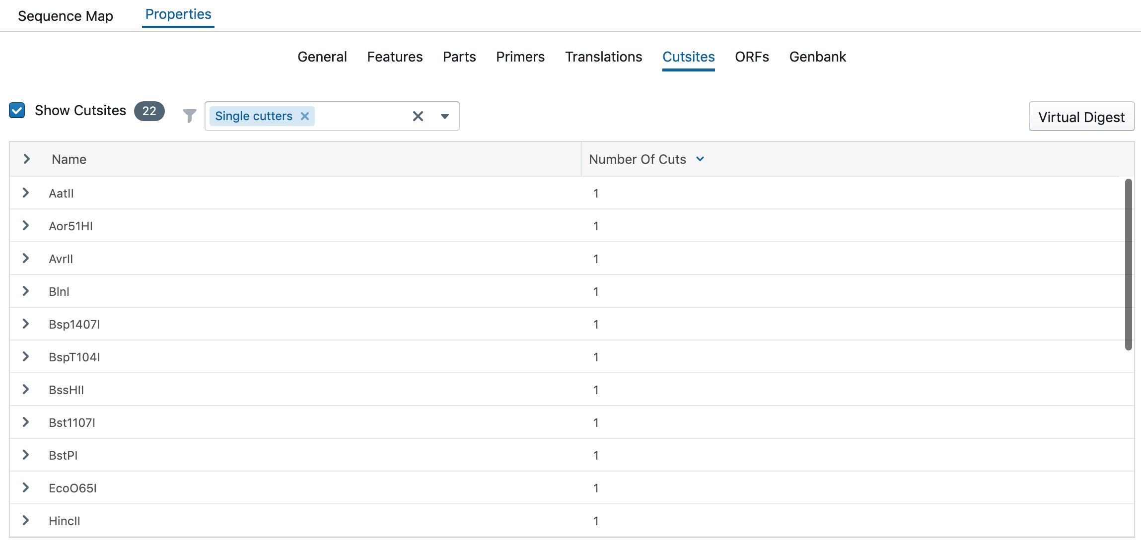 Virtual digest - view enzyme cut-sites and generate virtual digest details such as fragment length and overhang.