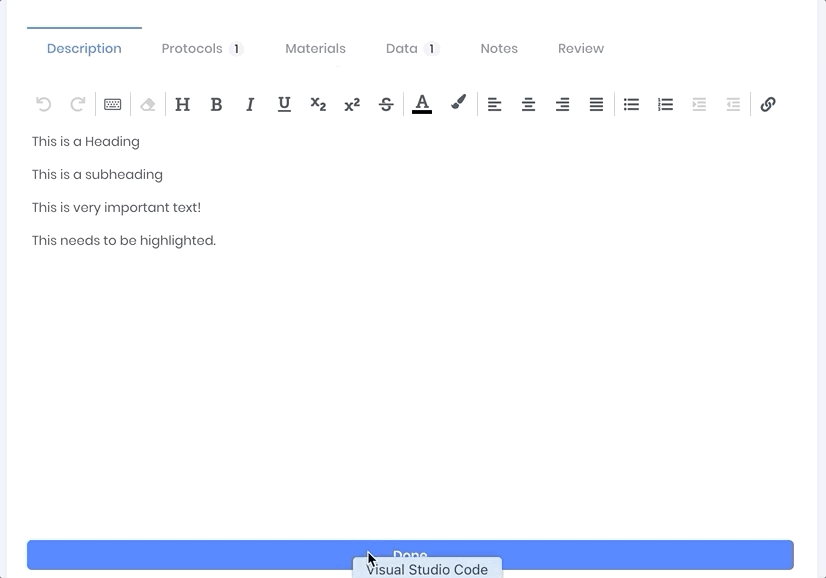 You can now set the font and highlight colour of text in the Experiment Description, and choose from 6 different heading levels.
