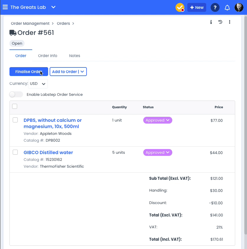 In this release we are introducing a new service to save you the time and hassle of dealing with suppliers directly. Simply toggle the switch to enable Labstep Order Services to have your Order fulfilled by a dedicated Labstep Agent.