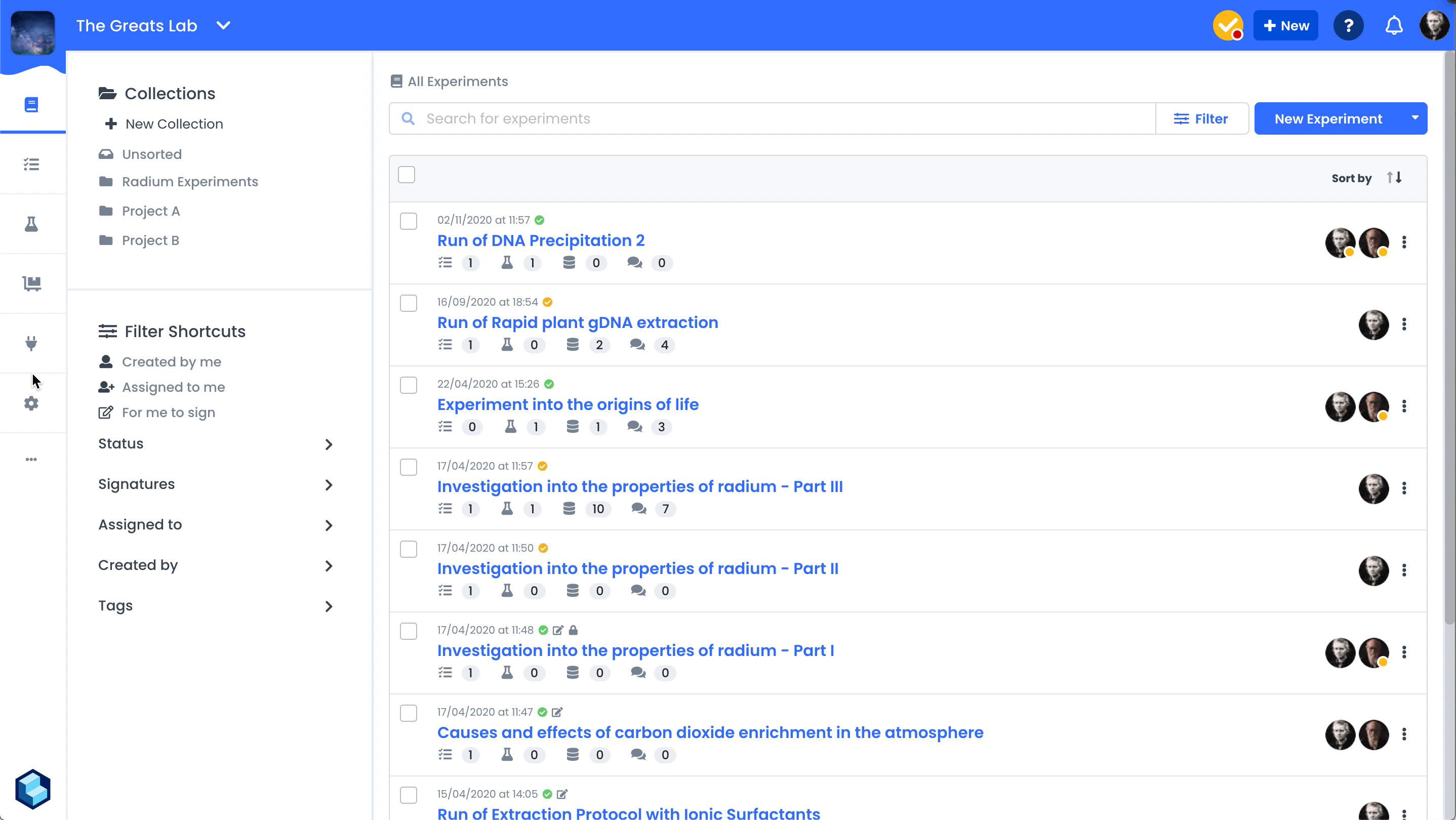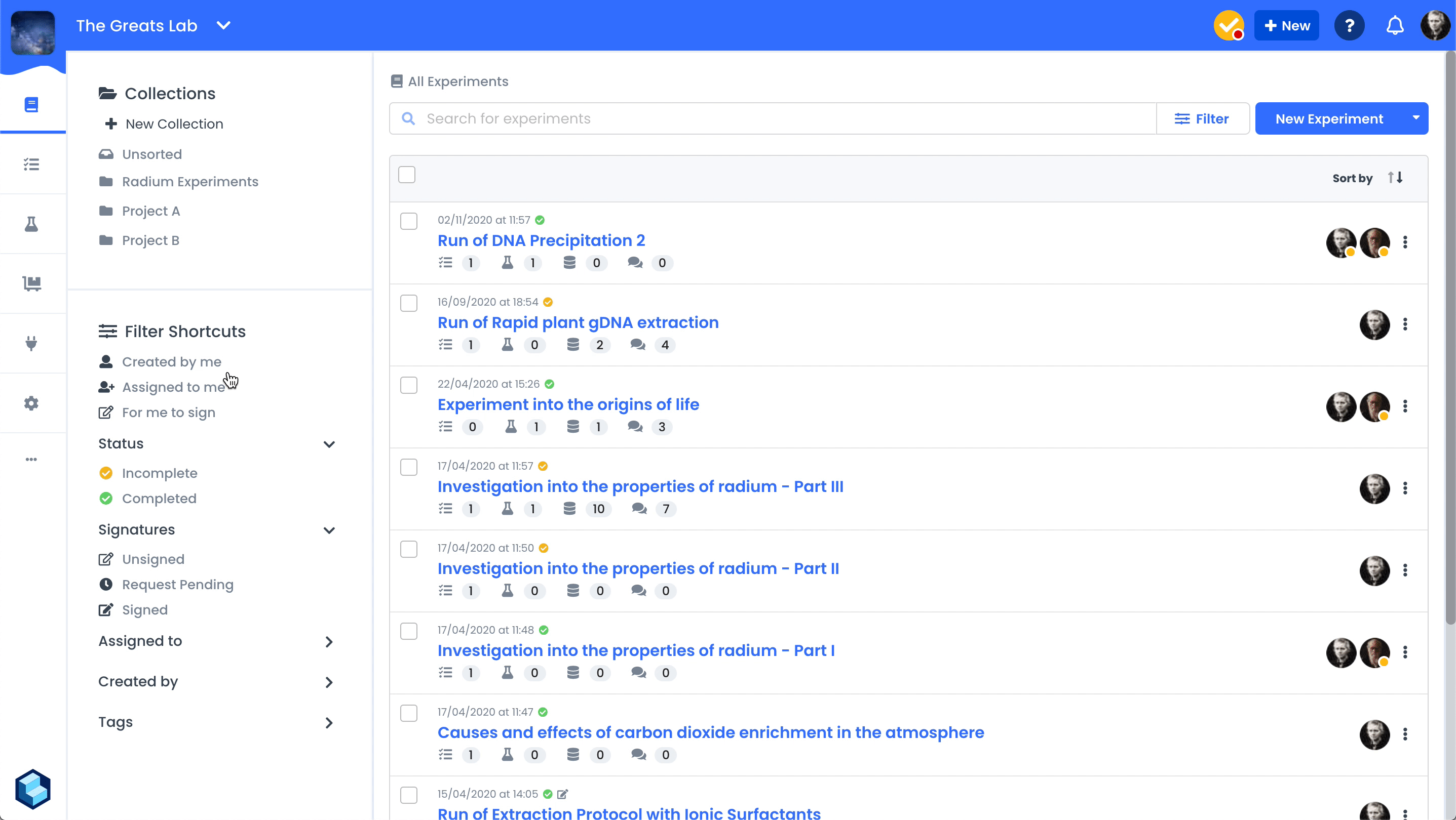 Top tip: Combine the 'Unsigned' filter with the 'Created by me' and 'Complete' filters to give you a list of experiments that you might want to request signatures for.