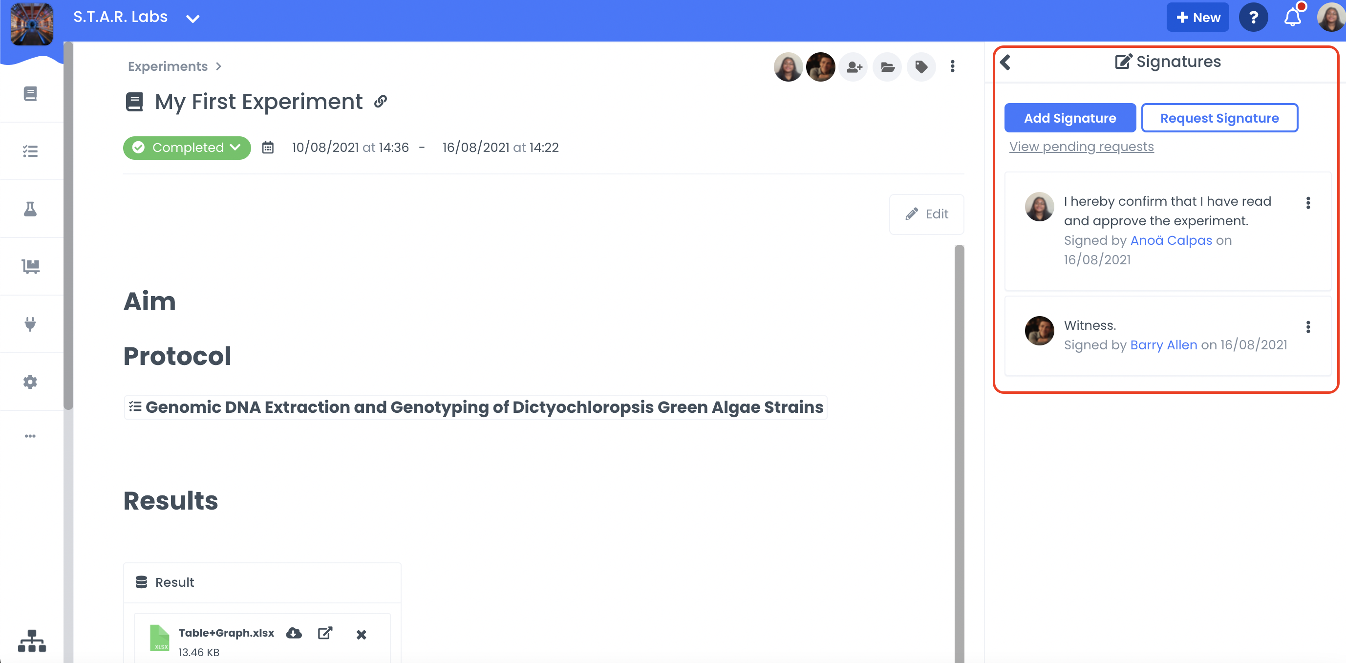 Labstep users can add and request signatures from within the 'Review' tab. You can add as many signatures as you like to an experiment that you can customise if required.