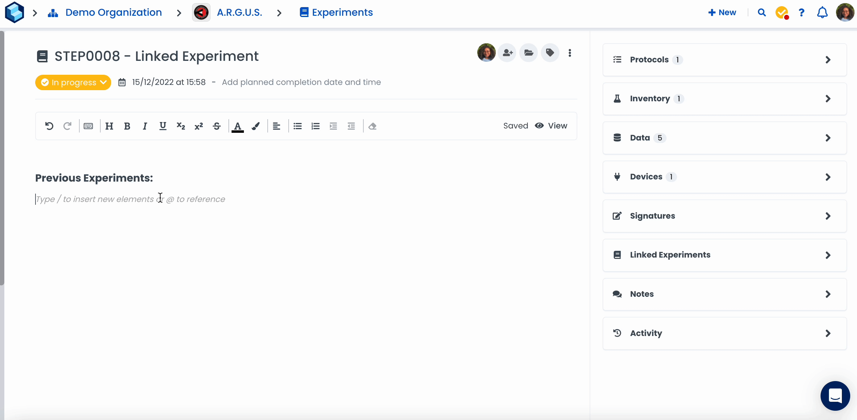 Labstep team tip: Click on the referenced experiment to easily access it. Navigate to 'Linked Experiments' to view all the experiments linked to it.