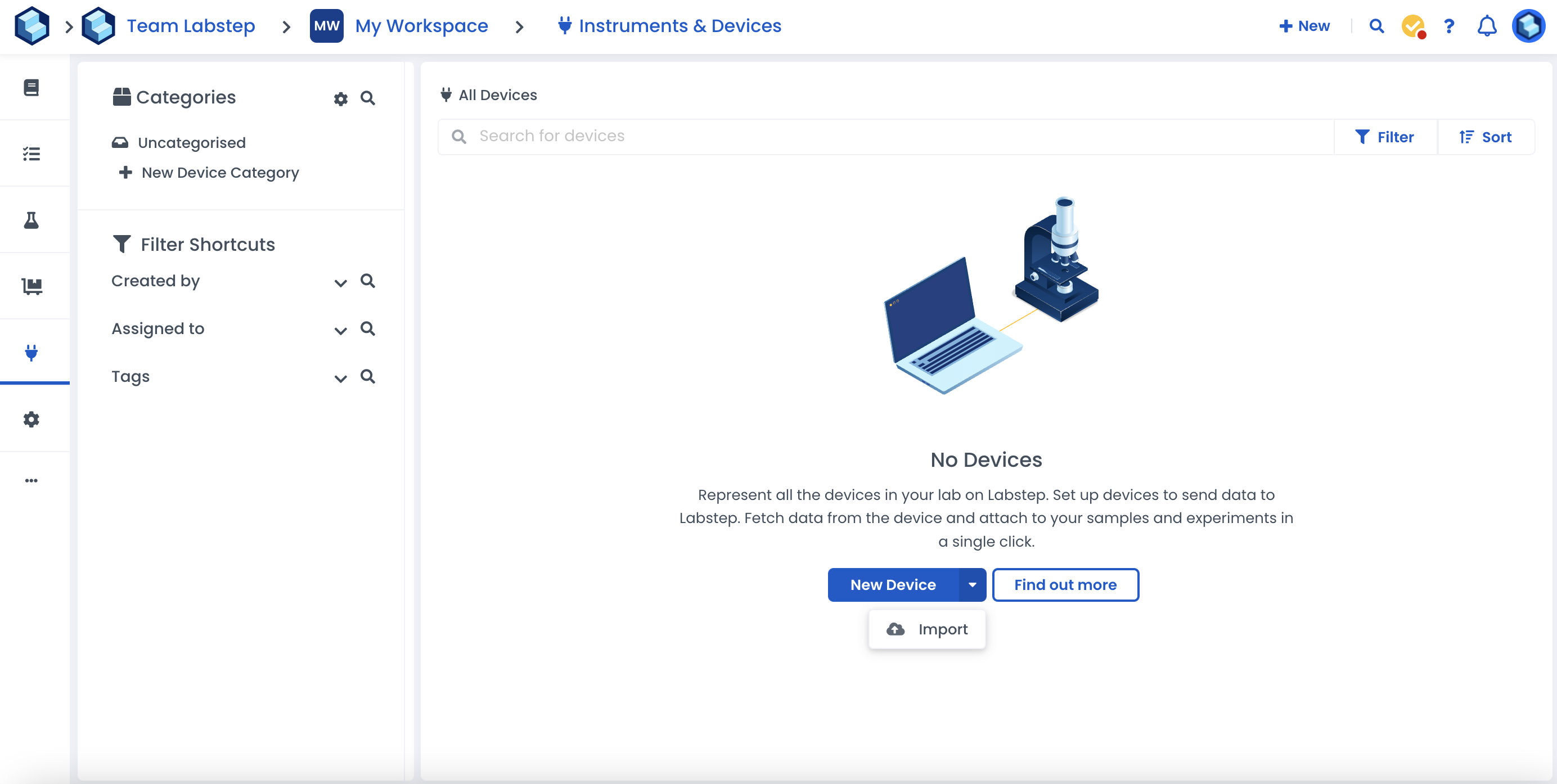 Labstep team tip: You can also import your instruments & devices by uploading a csv/xlsx file.