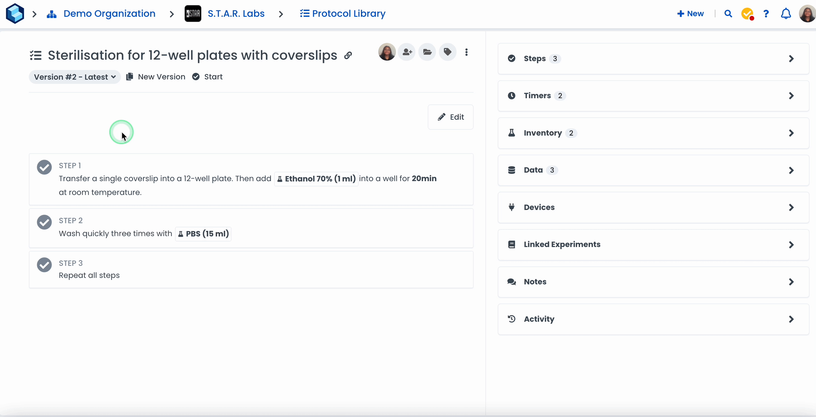 With the new navigation bar, see more clearly the hierarchy of where you are (Organisation → Workspace → Module). You can now navigate straight to the module you want, even if it's within another Workspace. Simply click the Labstep logo on the left and uncollapse the Workspace you want, et voilà!
