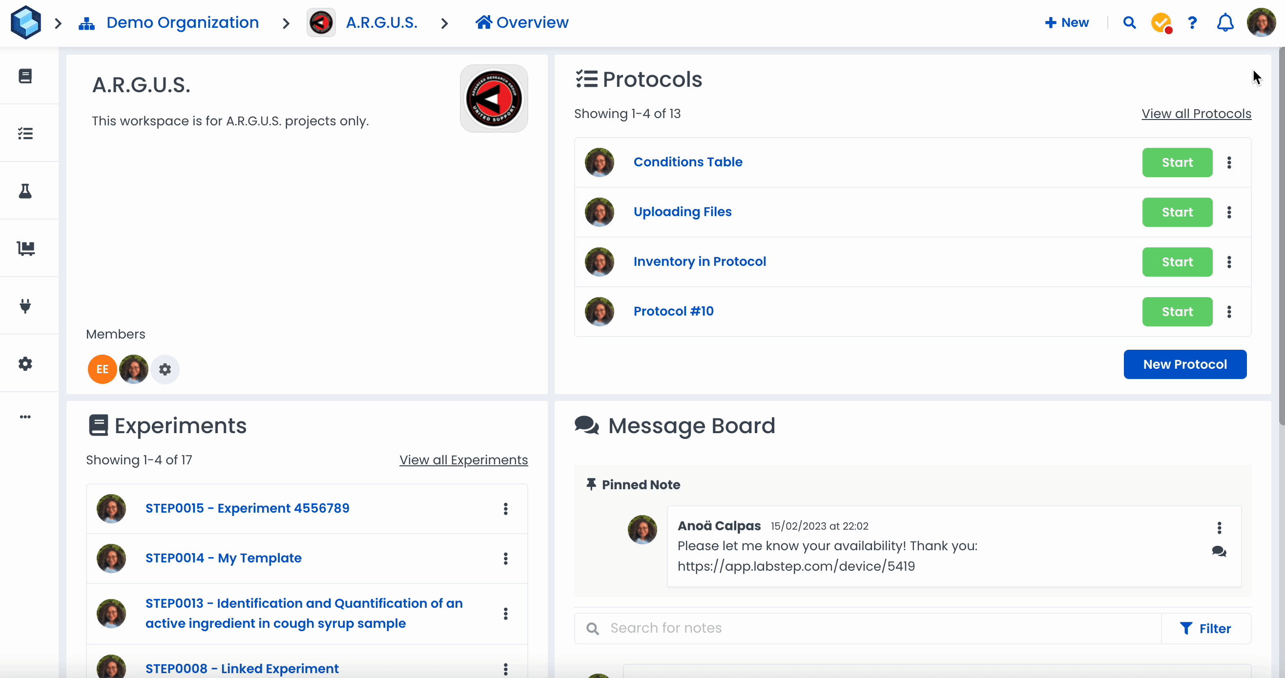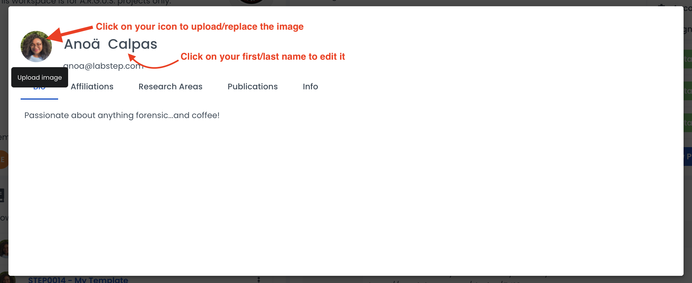 You can set up your profile and add any necessary information, such as which days you are in the lab/office or even articles you've written. Your collaborators and members of your organisation will be able to view your profile and anything you've made public there.
