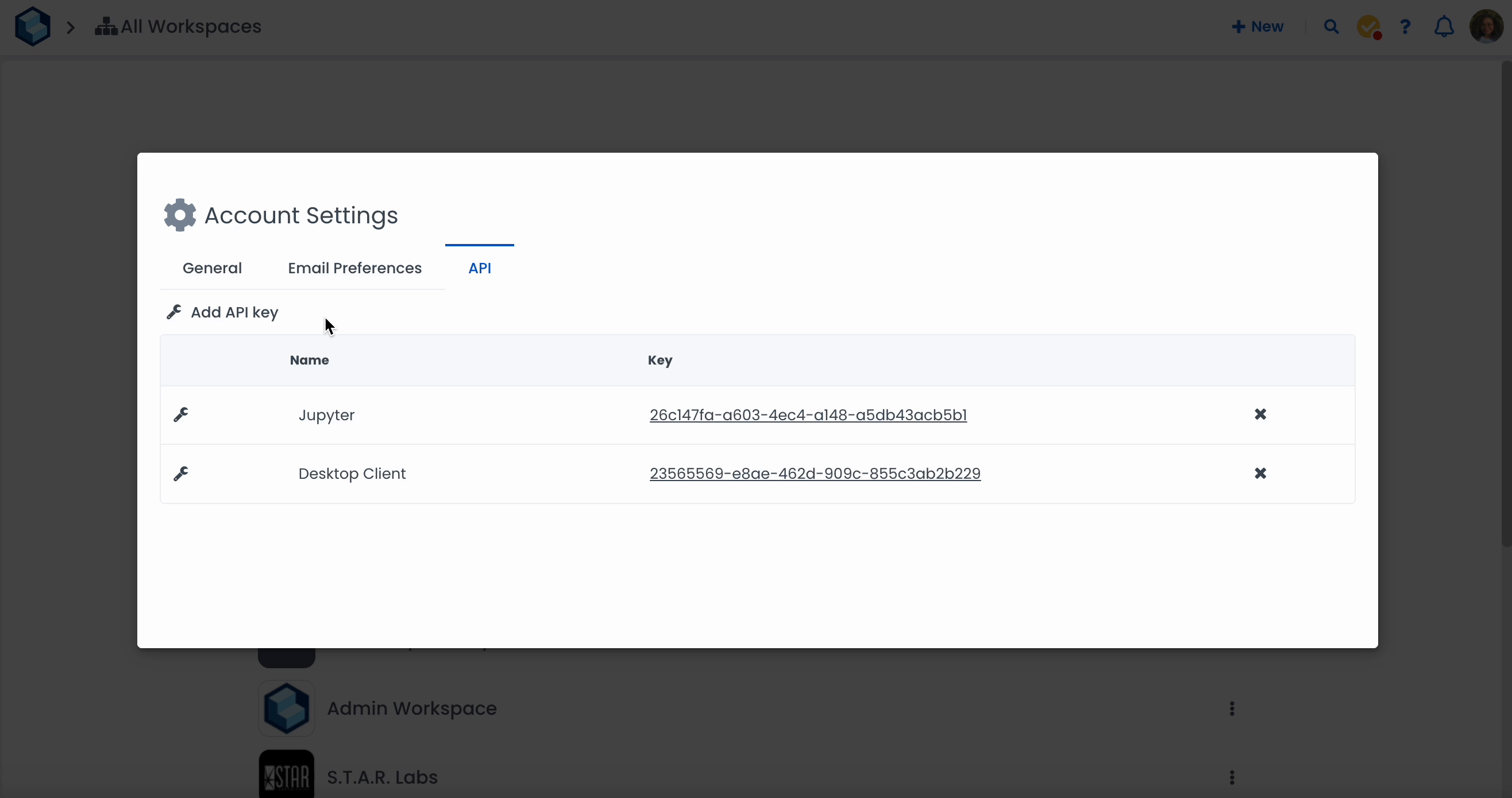 From your account settings, you'll also find an "API" tab. You can create one or multiple API keys. You can use your API keys for things like using our Jupyter Notebooks integration, our Export Client.
