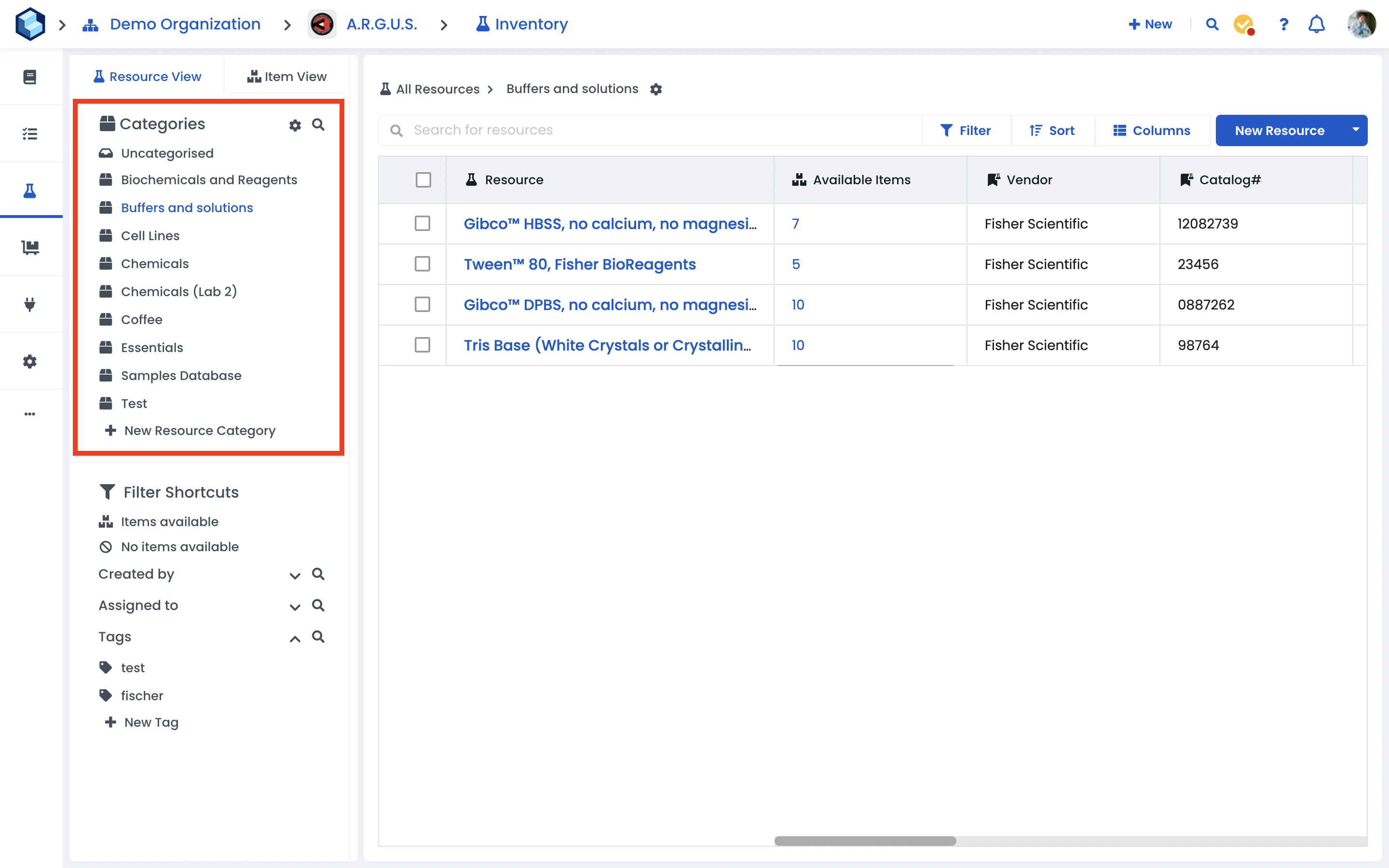Resource Categories are the highest level of the Inventory module. They can be used to further group resources into broad general buckets such as "Reagents," "Samples," and "Chemicals".