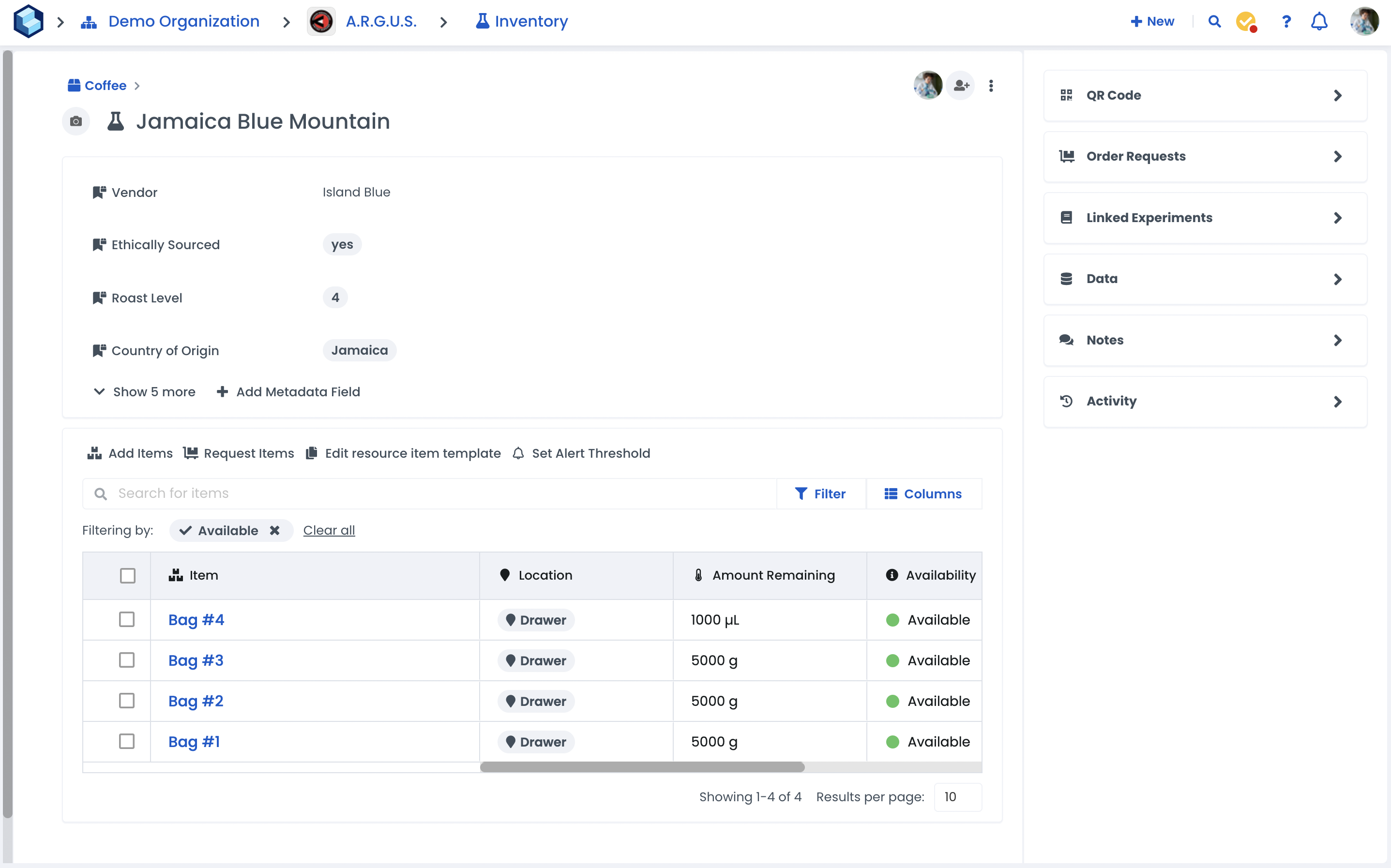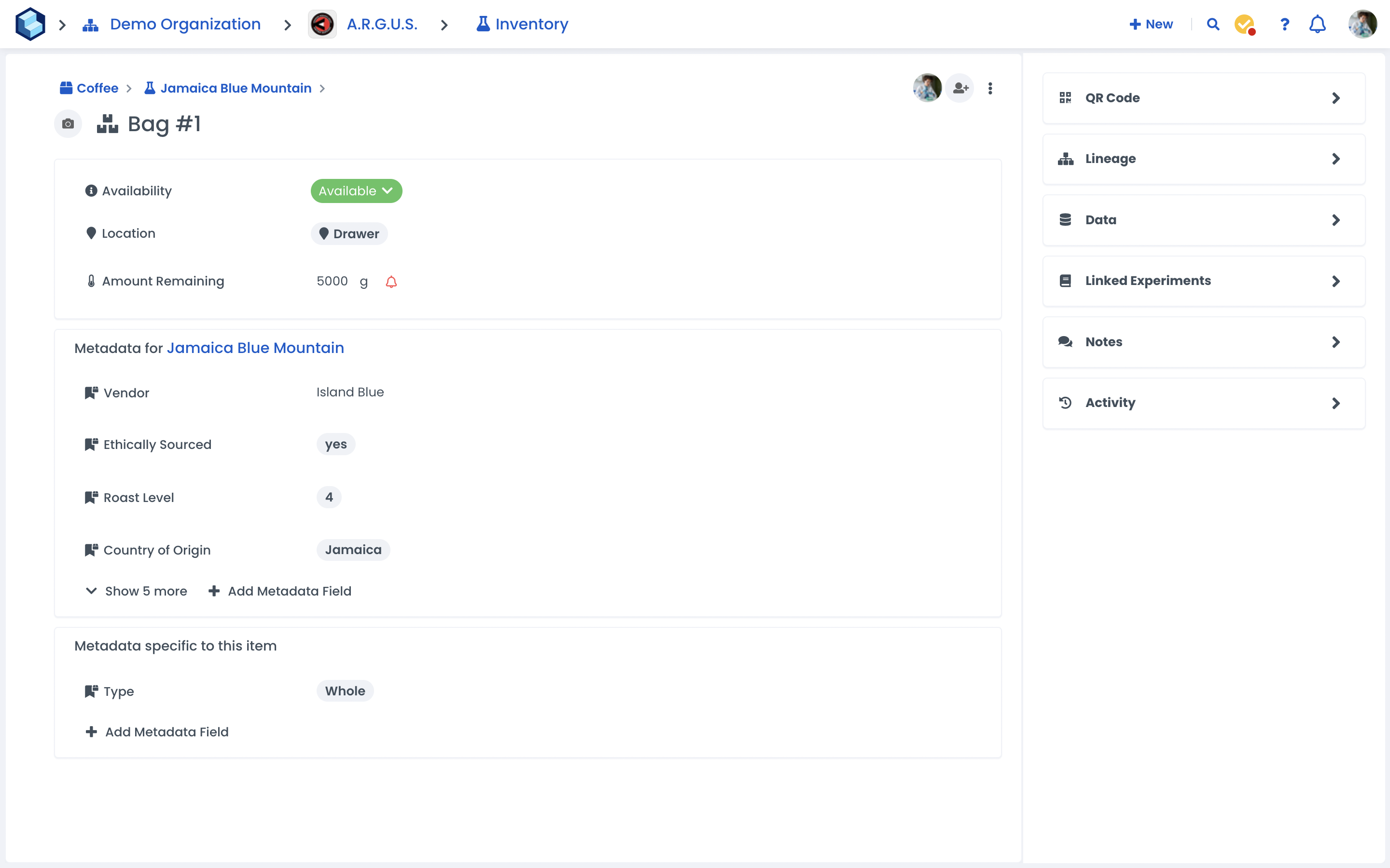 The most granular level of the Inventory module is Items. These represent the physical items you have in the lab. You can specify their location, amount remaining, and other metadata specific to the item i.e. Expiry Date, Lot number. Each item also has a unique QR code that you can print and scan, which makes it easy to specify exactly what was used in an experiment and can also speed up stock checks.