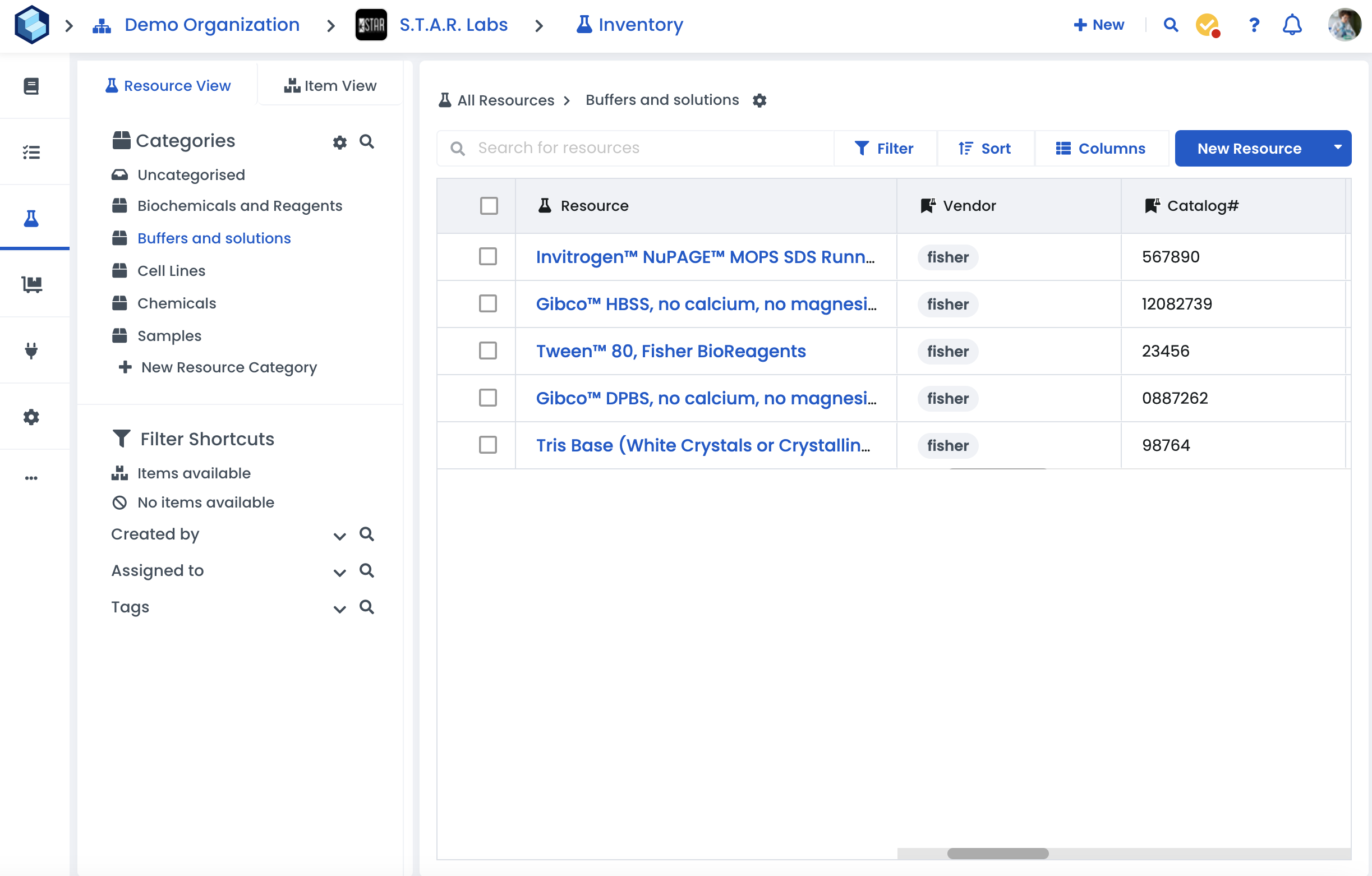 Resource Category → a group of resources of the same type | i.e. Biochemicals and Reagents