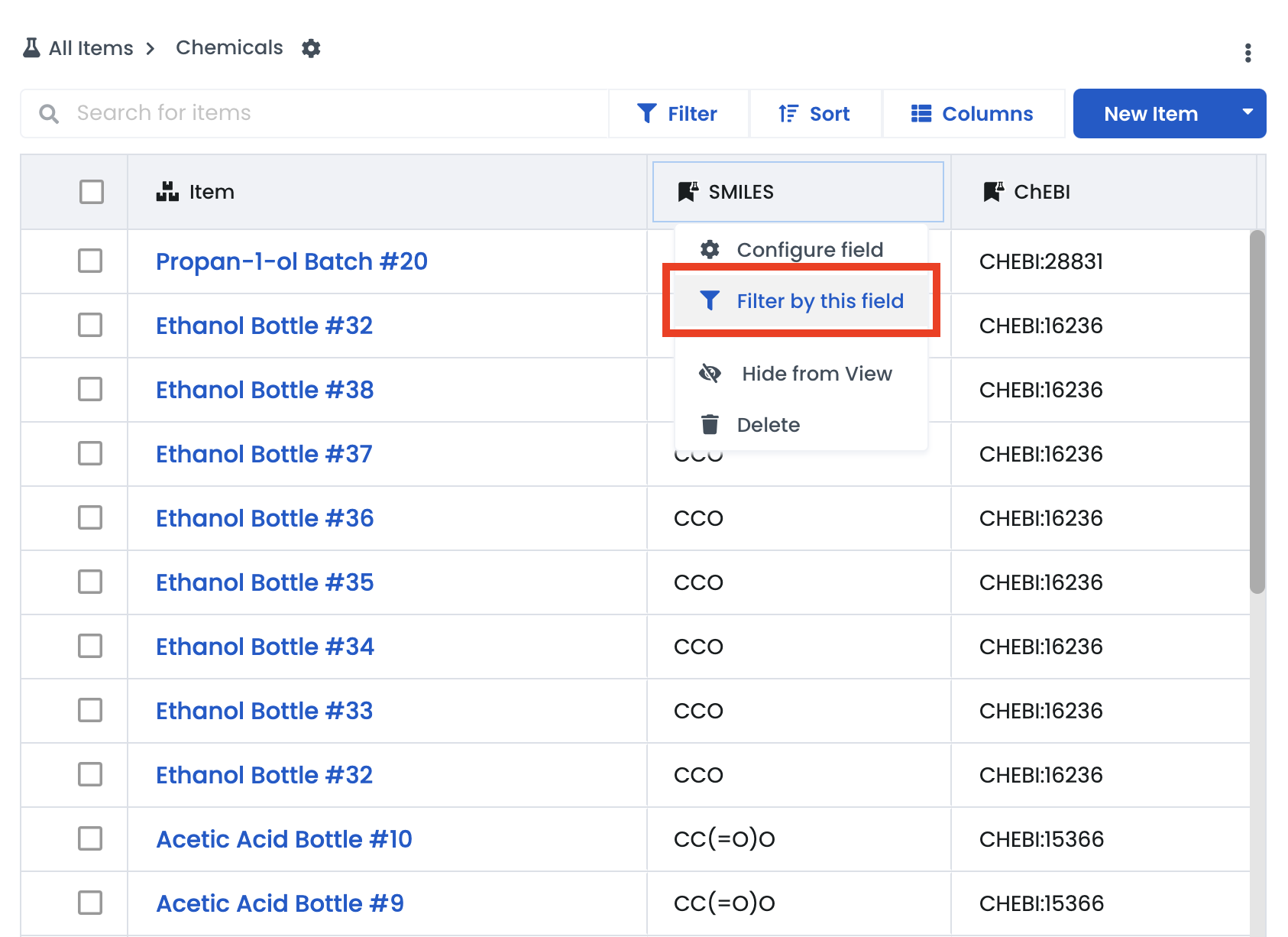 Chemistry | You can add structures and fetch PubChem data. For more information on the Chemistry tools, click here | You can filter by Chemical structure. |